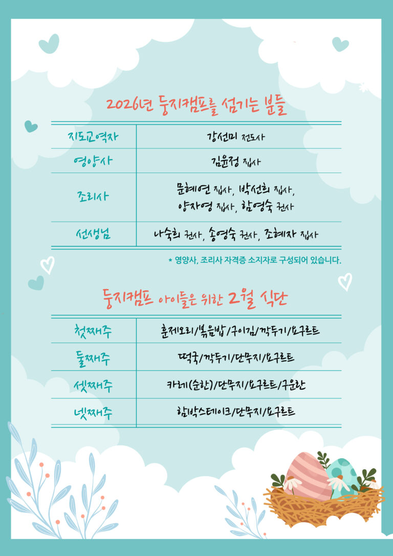 우리 교회에서는 아침에 일찍 교회에 나오는 아이들을 돌보고 아침식사를 제공하고 양육하는 둥지캠프 프로그램을 진행합니다. 둥지 캠프 안에는 따로 영양사 분들이 계셔서, 아이들의 건강을 위해 매월 균형 있는 식단을 짜고, 선생님들이 아침마다 안전하게 돌보고 있습니다.
